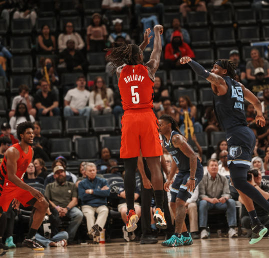 次节比赛,开拓者逐步取得39-35领先,吕佩尔面对旧主命中三分帮助灰熊逐步反超1分,罗威三分回敬。灰熊冲击内线反超3分,开拓者连得4分,灰熊一波9-0攻势反超比分,克林根肘击普罗斯珀被吹罚二级恶意犯规被驱逐离场。灰熊回敬一波12-4攻势追分,开拓者单节27-31输掉4分,上半场结束双方维持59-59。前两节比赛,开拓者27中9,霍勒迪14分、格兰特12分与罗威10分;灰熊三分16中7,斯潘塞12分与普罗斯珀12+5。