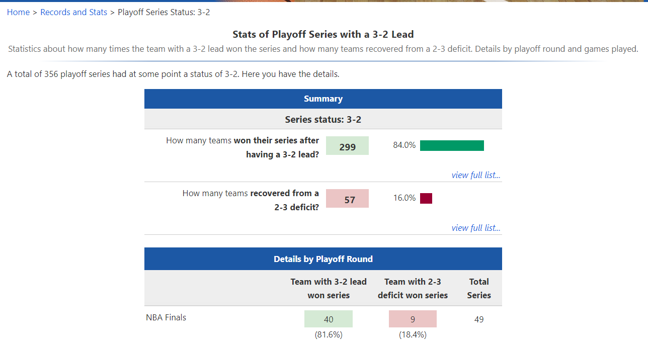 根据NBA历史来看,2-3落后的球队在季后赛是299负57胜,逆袭概率只有16%,如果是总决赛则9胜40负,逆袭概率18.4%,不管从哪一方面来看步行者都是命悬一线,步行者在G6就失利的概率太高了。