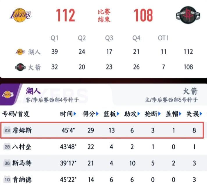 央视网:《詹姆斯29+13+6命中绝平三分 湖人加时胜火箭夺赛点》2026年4月25日懂球帝:《湖人加时112-108火箭3-0夺赛点,詹姆斯29+13+6&绝平三分,申京33+16》2026年4月25日