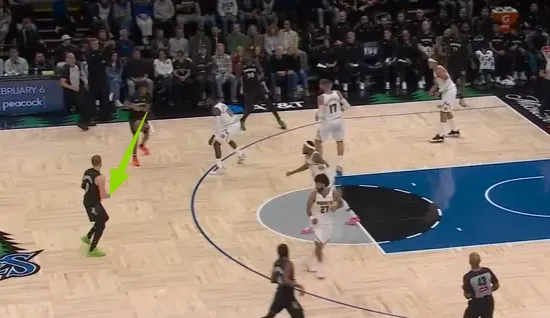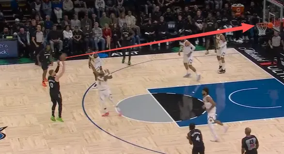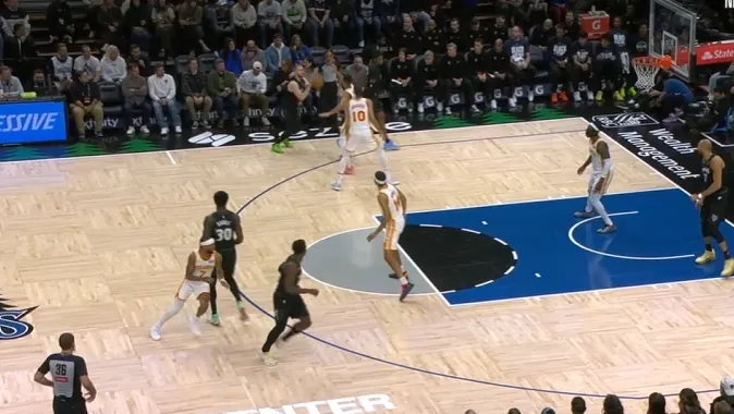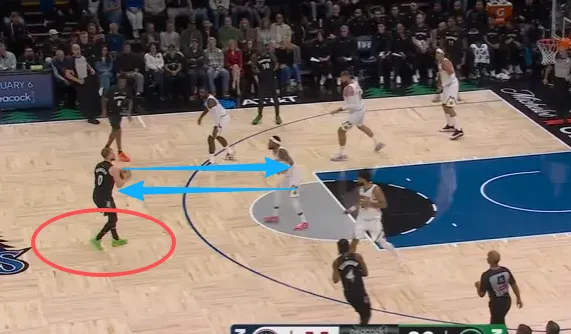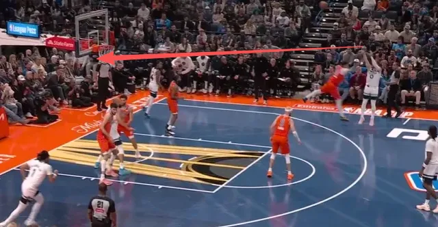 杰登左翼接球后立即与同侧底角上提的迪文发动边路手递手配合,迪文手递手接球后借助一丝投篮空间拔起就射,三分手起刀落。