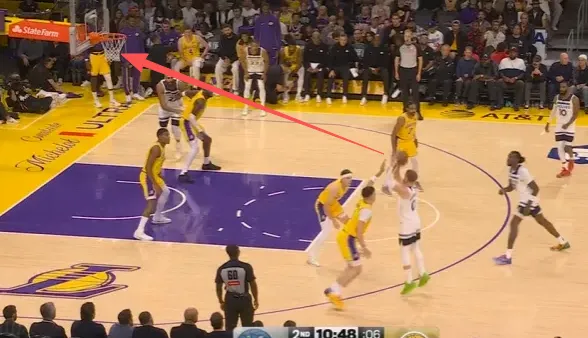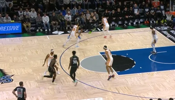 转换进攻回合海兰德持球过半场后立即传球找到拖车跟进至弧顶的迪文琴佐,迪文三分线外一步接球上步调整后直接拔起出手三分,一箭穿心。