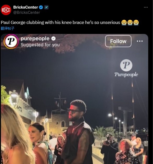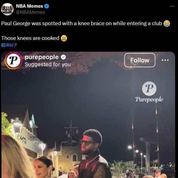 NBA Memes写道:“乔治戴着护膝进入夜店,看来他的膝盖要备受煎熬了!”